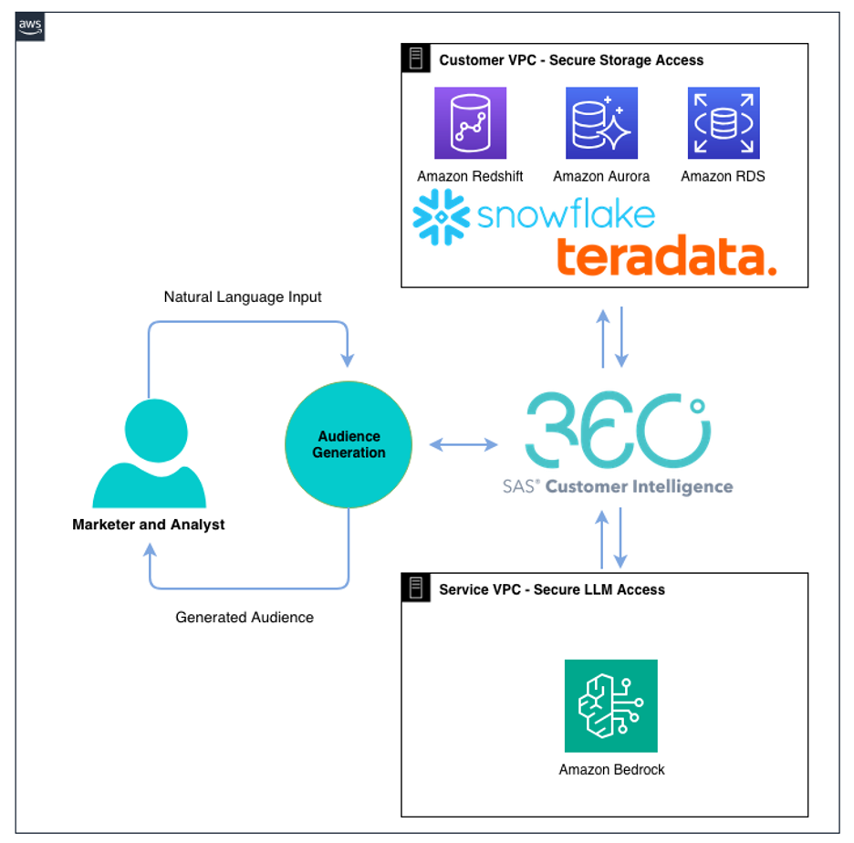 The integration architecture ensures enterprise-grade performance and scale while maintaining ease of use. When a marketer inputs their audience description, Amazon Bedrock’s language models process the request, understanding both explicit and implicit targeting requirements. The system then maps these requirements to the robust audience management capabilities of SAS Customer Intelligence 360, creating technically precise audience definitions that align with data governance standards.