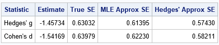 The following DATA step reads in the statistics for each group and forms the Cohen’s d and Hedges’ g statistics: