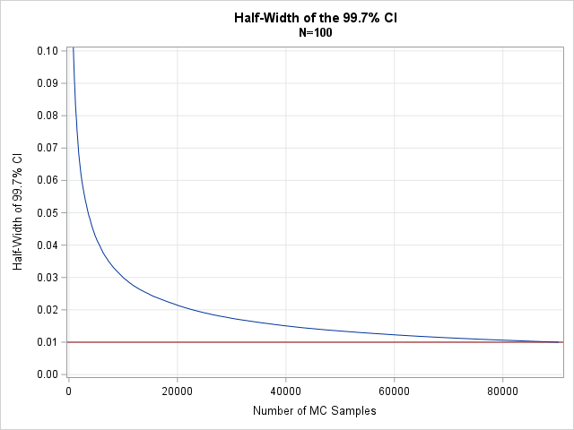 number of simulations. In this graph, you can see the slow rate at which the CI decreases. The half-width doesn’t drop below 0.01 until after 90,000 simulations.